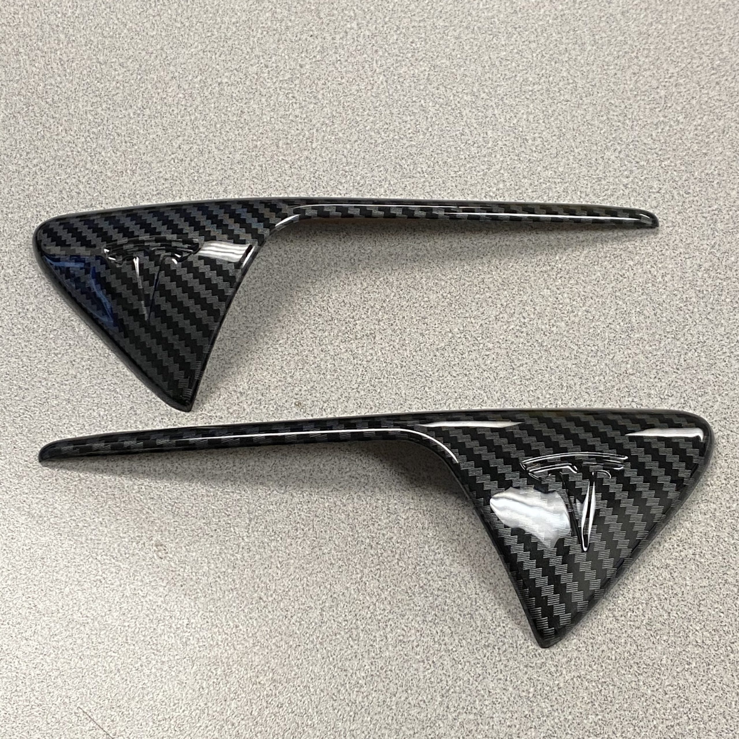 Diese neuen, günstigeren, mit Kohlefaser beschichteten Akzente passen hervorragend und haben ein vertieftes T wie auf dem Foto. Sie sind nur in einer glänzenden Oberfläche erhältlich. Wenn Sie jedoch eine matte Oberfläche wünschen, sollten Sie unsere Echtcarbon Version in Betracht ziehen.