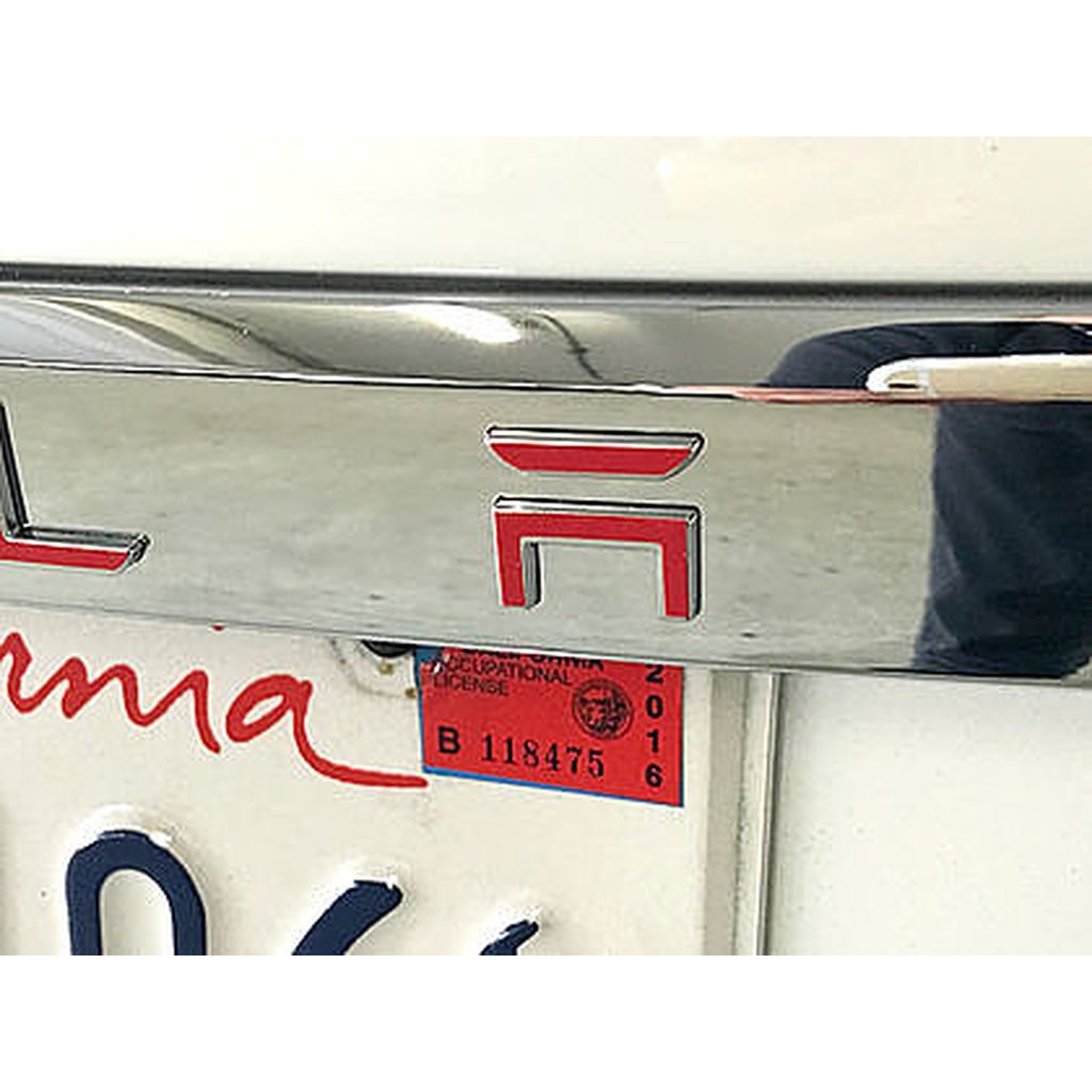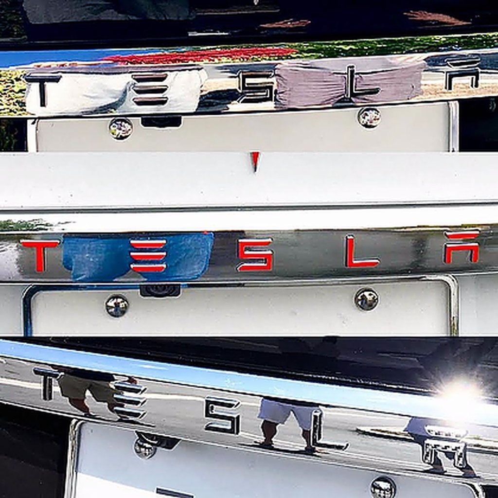 Tesla Schriftzug Heckklappe in reflektierendem Rot, Carbonlook, matt weiss und matt schwarz in T-E-S-L-A Buchstaben. Einfach 1 Buchstaben nach dem anderen installieren.