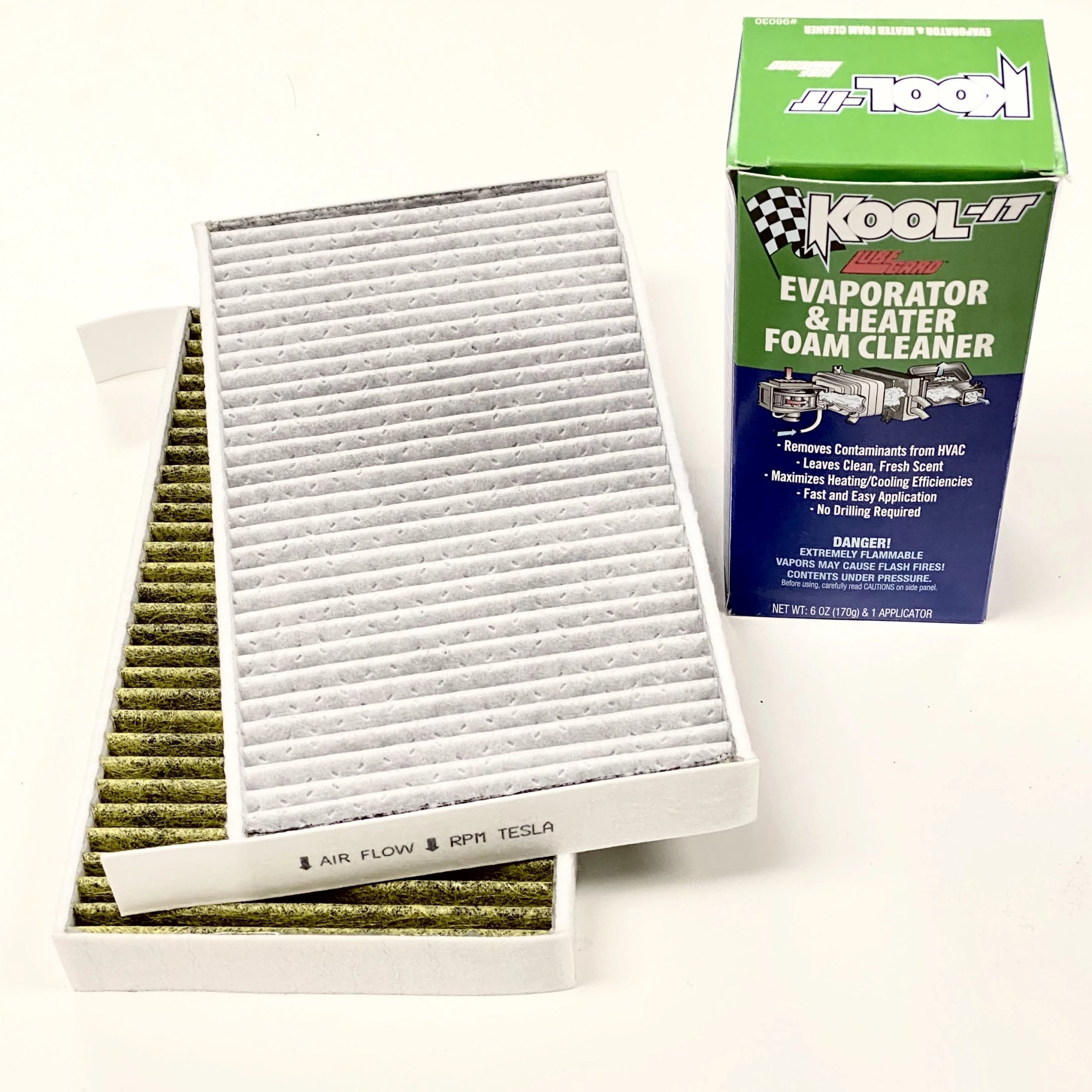Wir haben uns für den gleichen Schaumreiniger entschieden, den TESLA in seinem Servicecenter und mit seinem mobilen Service verwendet. KOOL-IT Verdampferreiniger von LubeGard. Dieser Reiniger beseitigt Gerüche, Allergene und Verunreinigungen wie Bakterien, Schimmel und Mehltau. Es bietet einen natürlich sauberen, frischen Duft. Auf dem letzten Foto finden Sie die Verkaufsbroschüre.