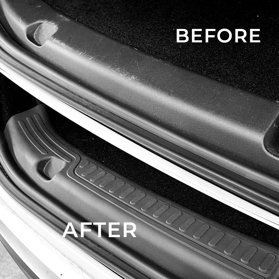 Unsere neue Einstiegsleistenabdeckung Model Y schützt Ihre Kofferraumschwelle aus Kunststoff vor Kratzern durch Gegenstände, die in Ihren Kofferraum geladen und entladen werden. Gepäck und andere Koffer werden über die serienmäßigen Kunststoffschweller geschleift und mit der Zeit abgenutzt, wie auf unserem ersten Vorher-Nachher-Foto gezeigt.