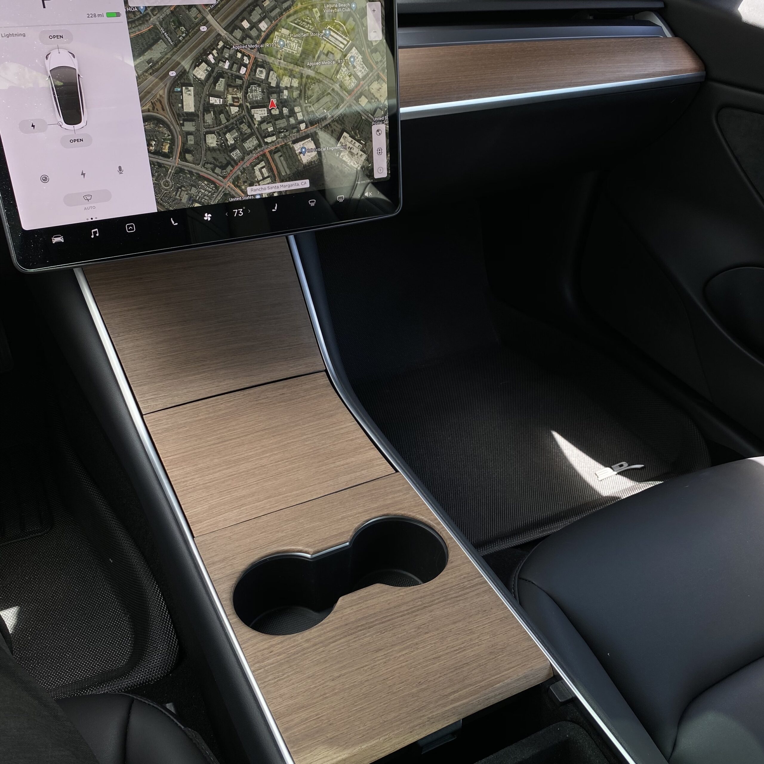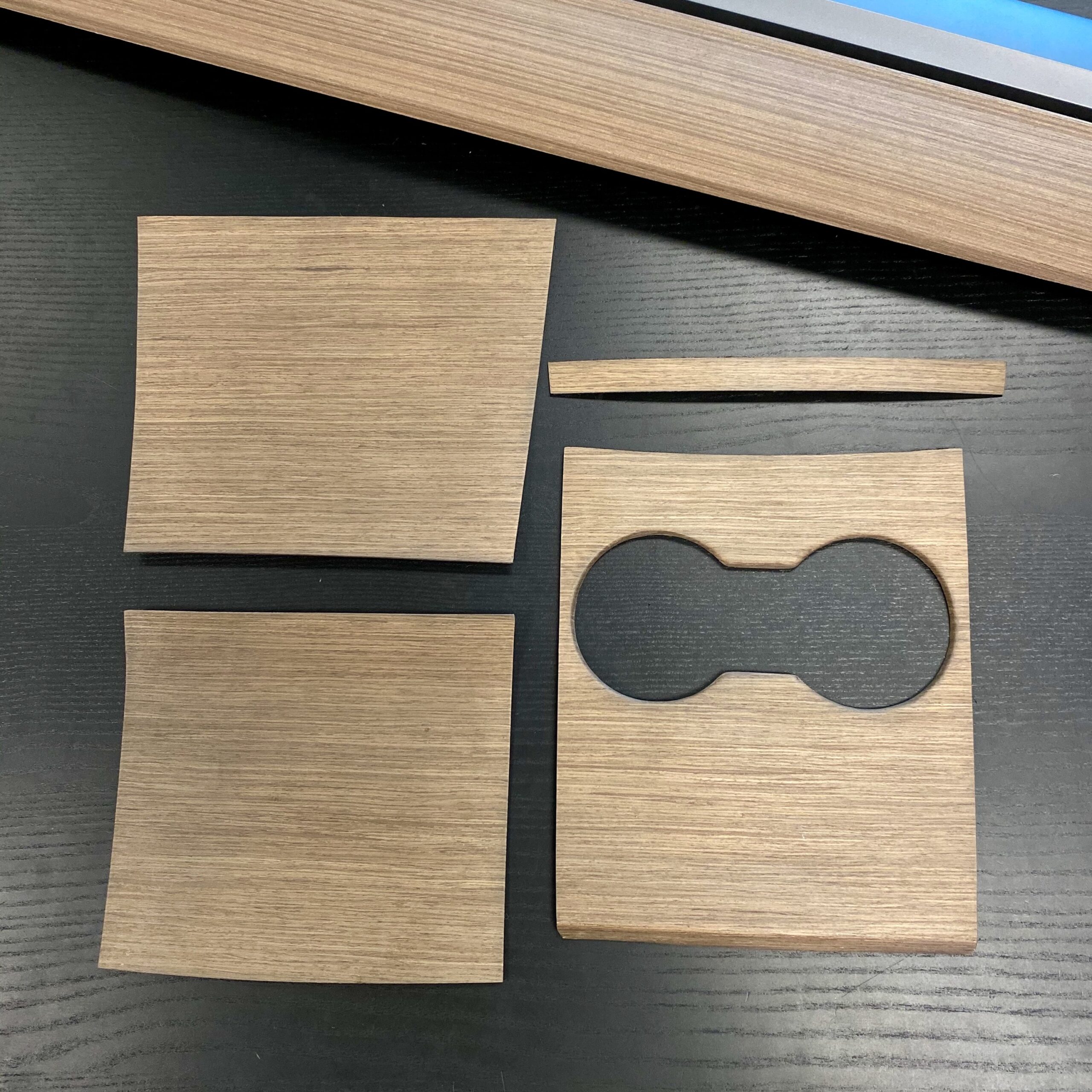 Dieses Echtholzfurnier wird genau wie Ihr TESLA OEM-Holz Armaturenbrett hergestellt. Es beginnt mit einem 0,5 mm dünnen Stück offenporigem Holz, das lasergeschnitten ist, damit passt es perfekt über die 3 Teile der Mittelkonsole und über das dünne Teil unter dem Monitor. In der Produktion verbinden wir das Holzfurnier mit einem sehr dünnen geprägten Stück Aluminium zur strukturellen Verstärkung und Steifigkeit. Das Aluminium wird dann auf der Rückseite mit Schutzfilzmaterial und doppelseitigem 3M VHB-Klebeband abgedeckt, das die Auflage an Ihrer Mittelkonsole hält. Dann versiegeln wir das Holz und veredeln es, um es wasserdicht und schmutzabweisend zu machen.