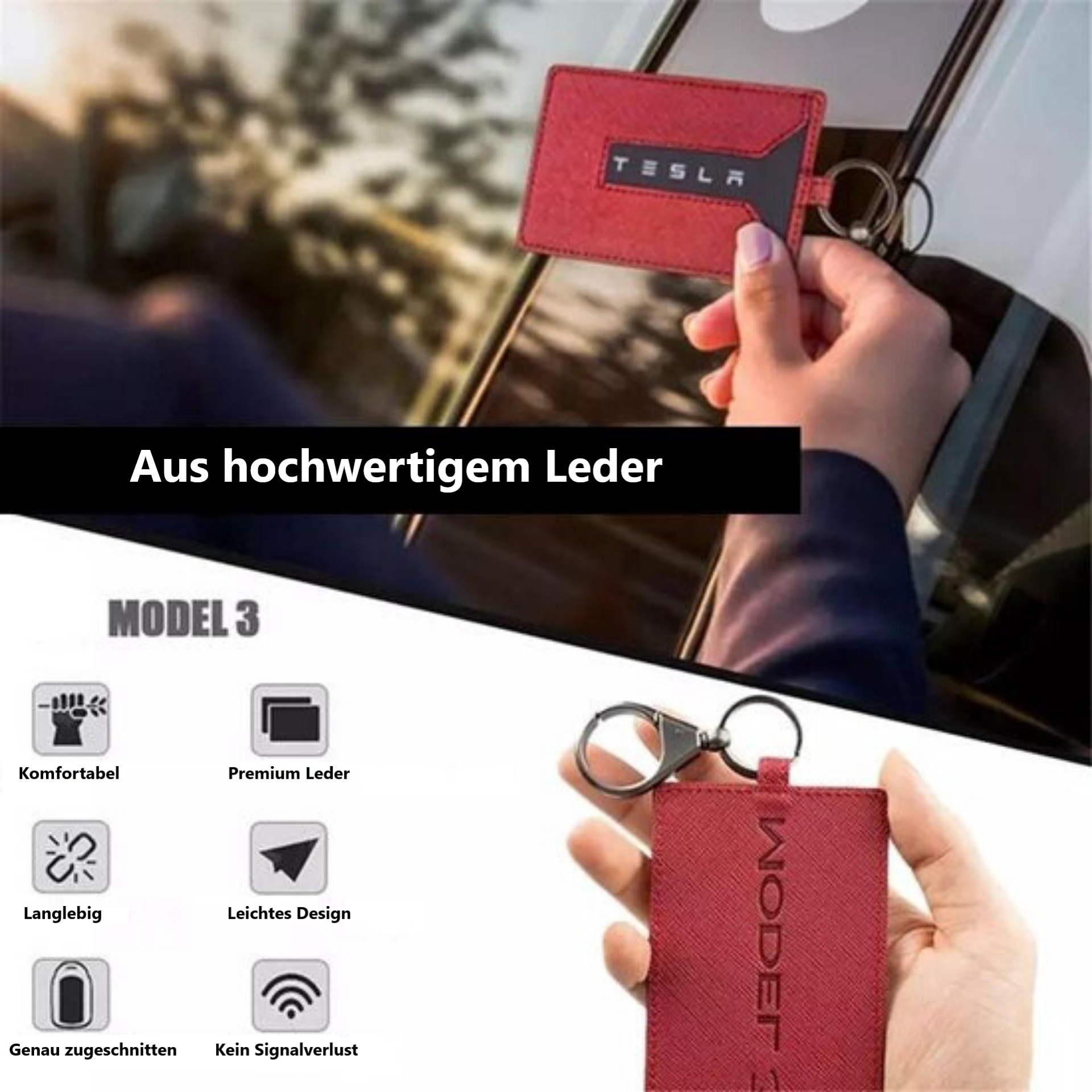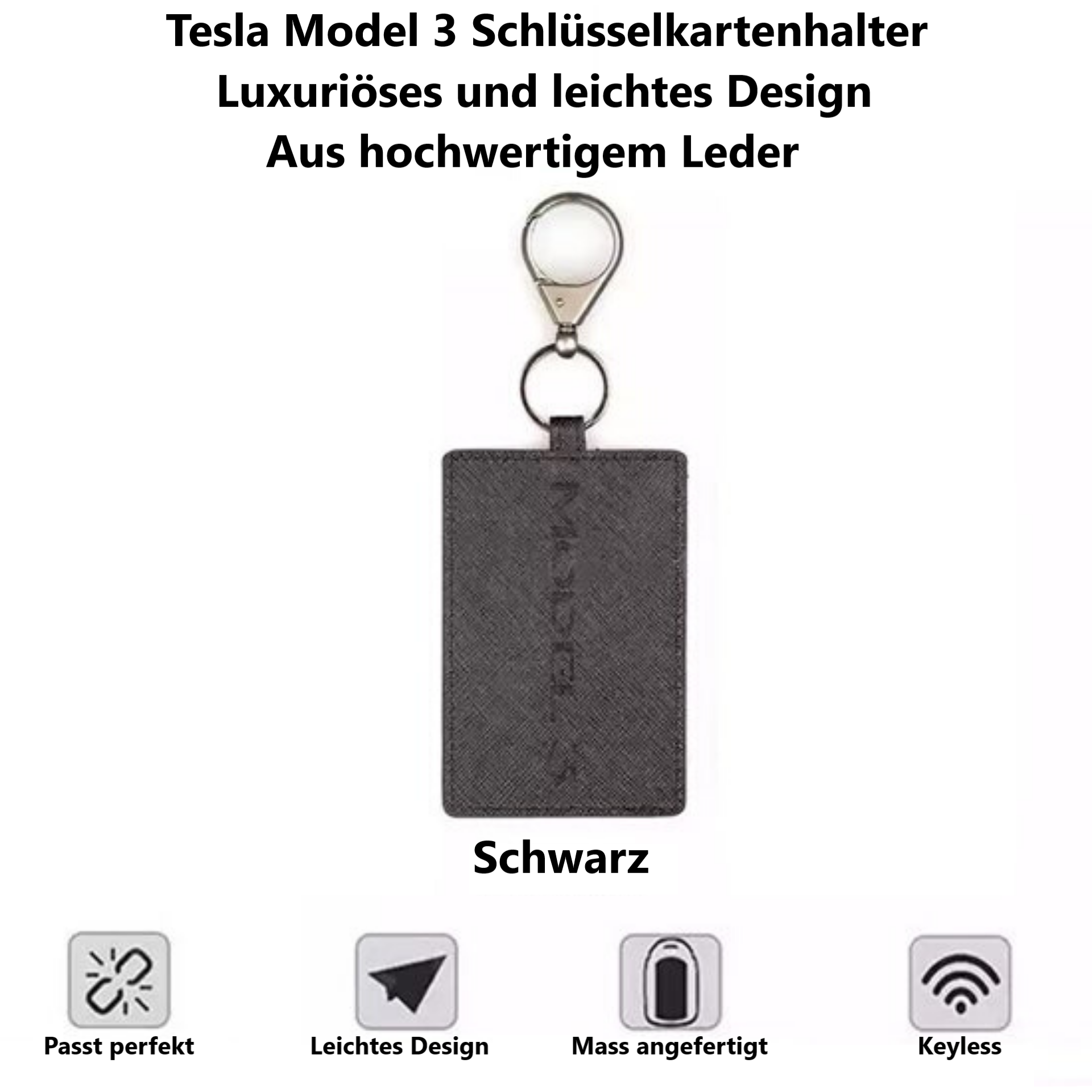 Der Schlüsselkartenhalter Model 3 PU ist ein echtes Muss. Dies ist die Lösung, um die Schlüsselkarte ordentlich überall mitzunehmen und sie zu schützen. Erhältlich in den Farben Schwarz oder Rot. Das Material besteht aus PU Kunstleder, sodass Sie dieses unverzichtbare Accessoire über Jahre hinweg genießen können.