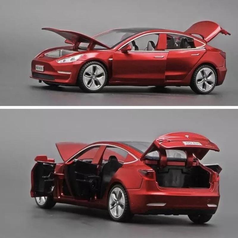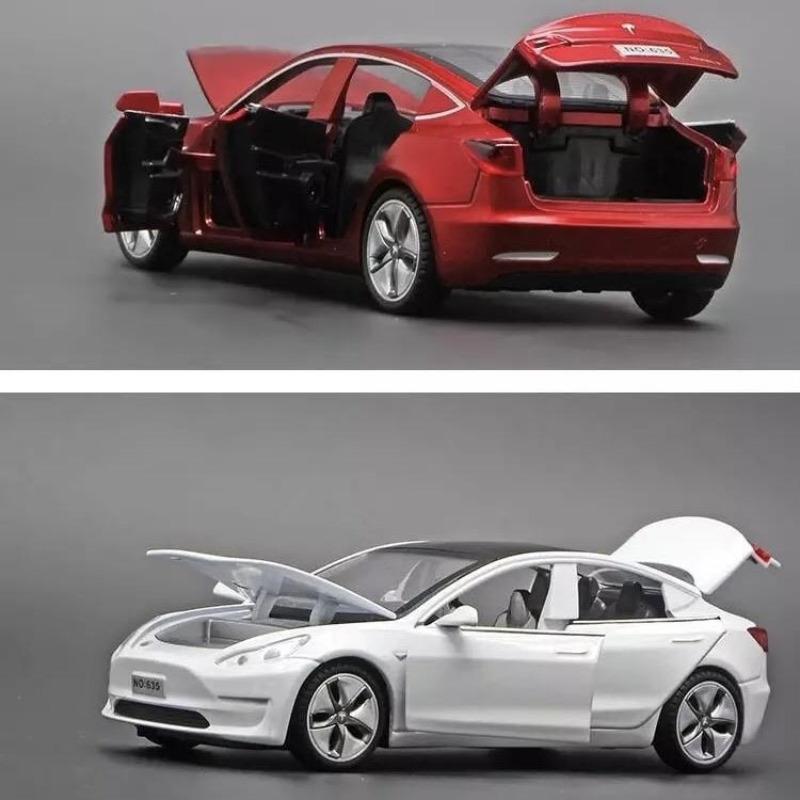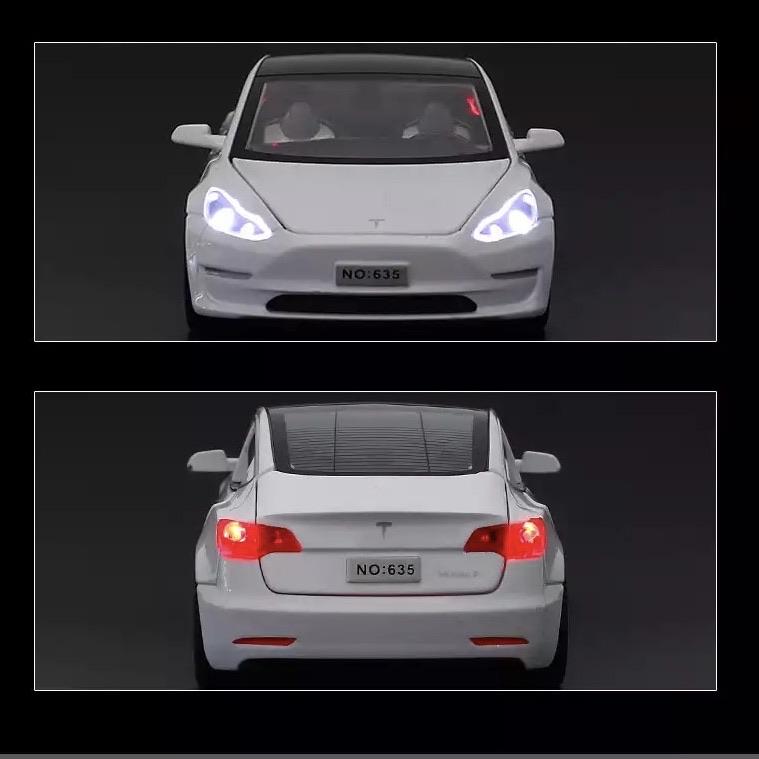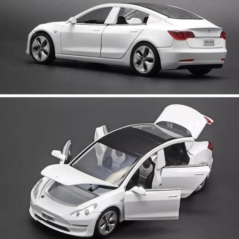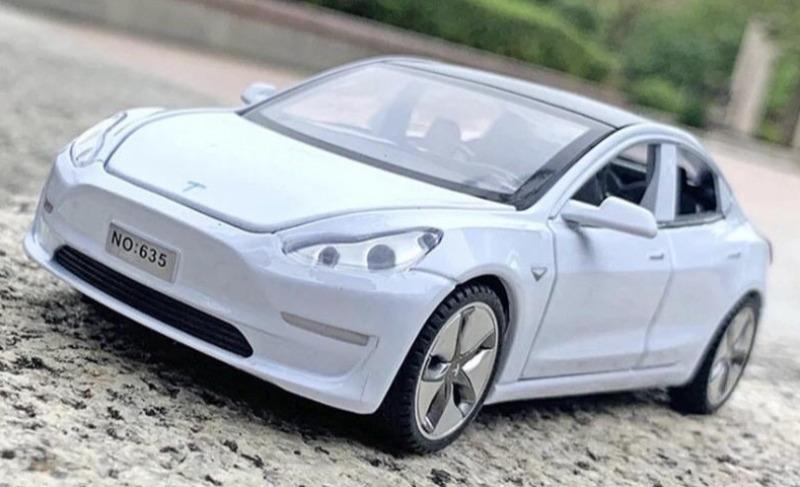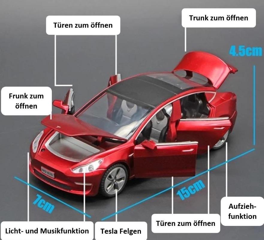 Tesla Model 3 Modellauto 1:32 mit Musik (diverse Klänge), Licht, Metallgehäuse und mit Aufziehfunktion